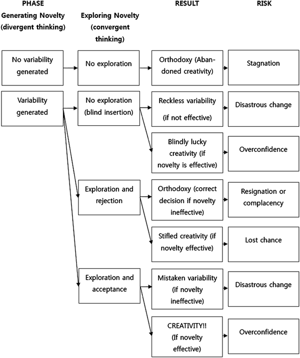 Therefore, not only does lack of knowledge reduce the possibility of generation of variability in the first place, but even where variability is generated, lack of exploration (convergent thinking) raises the possibility of reckless variability and exposes the system in question to the risk of disastrous change or overconfidence (p. 399).