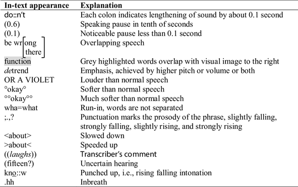 - Jefferson, G. (2004). Glossary of transcript symbols with an introduction. In G. H. Lerner (Ed.), Conversation analysis: Studies from the first generation (pp. 13–31). Amsterdam: John Benjamins.CrossRefGoogle Scholar