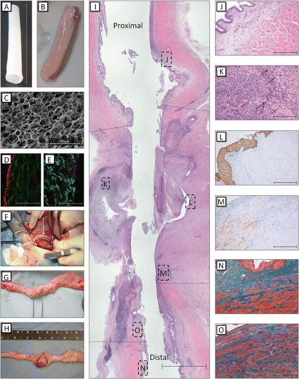 Implantation strategy and outcome after ureteral reconstruction using tubular collagen scaffolds. a, b Macroscopic overview of a tubular 0.5 % type-I collagen scaffold (length = 6 cm, Ø = 6 mm). c SEM overview of the scaffold surface, which was highly porous, facilitating cell penetration into the scaffold (scale bar = 500 μm) d Immunofluorescent staining for collagen (green), nuclei (blue), and RCK103 (red) of a cell-seeded scaffold. Urothelial cells (RCK103 positive) were lining the scaffold (scale bar = 400 μm). e Immunofluorescent staining for collagen (green), nuclei (blue), and α smooth muscle actin (red) of a cell-seeded scaffold. Smooth muscle cells (α smooth muscle actin positive) were found throughout the scaffold (scale bar = 400 μm). f The scaffolds were implanted by end-to-end anastomosis. g, h Ureteral regeneration was evaluated after 1 month. Four animals showed intact ureters (g), while seven animals presented with defects or dissections (h). i Histological overview of a regenerating ureter (scale bar = 5 mm). Black dotted lines indicate the anastomosis sites. Specific locations are highlighted (J–O). j Hematoxylin and eosin (HE) staining of the native ureter (scale bar = 400 μm). k Inflammatory response in the regenerating tissue near scaffold remnants (red arrows). Mostly lymphocytes, a few granulocytes, and some multinucleated giant cells (black arrows) were observed (scale bar = 200 μm). l Pancytokeratin staining in the middle of the neo-ureter, indicating the presence of (multilayered) urothelium (scale bar = 400 μm). m Smoothelin staining near the anastomosis site, indicating ingrowth and maturation of smooth muscle tissue into the neo-ureter (scale bar = 400 μm). n Masson’s trichrome staining of the native ureter (scale bar = 400 μm). o Masson’s trichrome staining near the anastomosis site, indicating the ingrowth of new muscle tissue (scale bar = 400 μm)