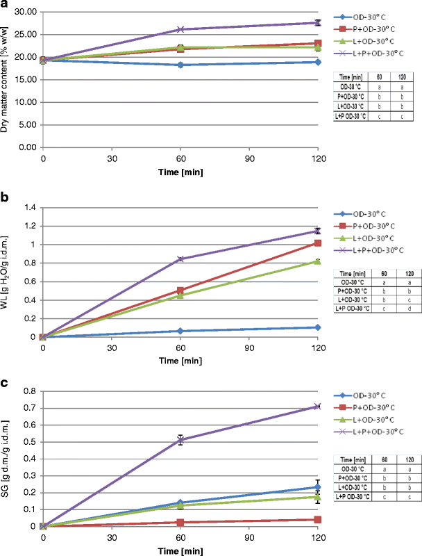 Changes in dry matter content (a), water loss (b), and solids gain (c) in highbush blueberry fruits during osmotic dehydration at 30 °C: without pretreatment (OD-30 °C); preceded by pretreatment by immersion in a water bath containing: pectinolytic enzyme (P+OD-30 °C); lipolytic enzyme (L+OD-30 °C); pectinolytic enzyme and following a water bath containing lipolytic enzyme (P+L+OD-30 °C). In the tables attached, the same letter in different cells within a given column indicates a lack of statistical differences (α = 0.05) between the results at particular processing times