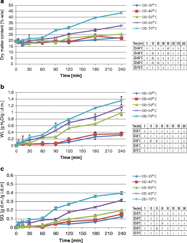 Changes in dry matter content (a), water loss (b), and solids gain (c) in highbush blueberry fruits during osmotic dehydration (OD) in 65 °Brix sucrose solution at 1:4 fruit to syrup ratio at different temperatures (30, 40, 50, 60, and 70 °C). In the tables attached, the same letter in different cells within a given column indicates a lack of statistical differences (α = 0.05) between the results at particular processing times