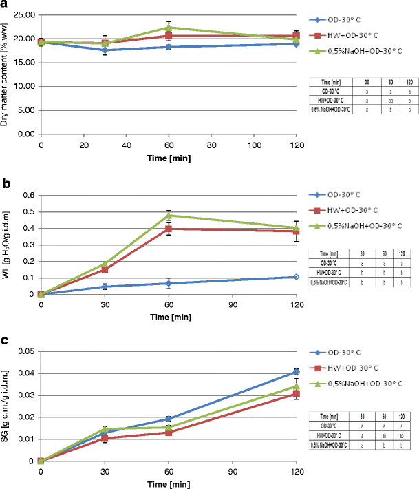 Changes in dry matter content (a), water loss (b), and solids gain (c) in highbush blueberry fruits during osmotic dehydration at 30 °C: without pretreatment (OD-30 °C); preceded by pretreatment in hot water (HW+OD-30 °C); preceded by pretreatment in hot water and in hot NaOH at 100 °C (HW+NaOH+OD-30 °C). In the tables attached, the same letter in different cells within a given column indicates a lack of statistical differences (α = 0.05) between the results at particular processing times