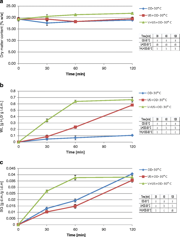 Changes in dry matter content (a), water loss (b), and solids gain (c) in highbush blueberry fruits during osmotic dehydration at 30 °C: without pretreatment (OD-30 °C); preceded by pretreatment with ultrasound (US+OD-30 °C); preceded by pretreatment with ultrasound and under low pressure (US+V+OD-30 °C). In the tables attached, the same letter in different cells within a given column indicates a lack of statistical differences (α = 0.05) between the results at particular processing times