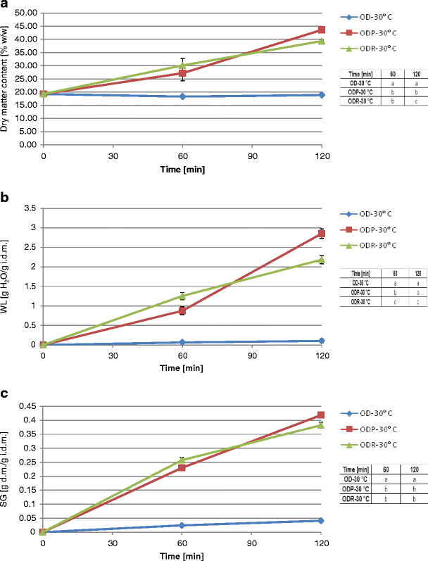 Changes in dry matter content (a), water loss (b), and solids gain (c) in highbush blueberry fruits during osmotic dehydration at 30 °C (OD-30 °C); in the presence of Pectinex Yield Mash enzyme (ODP-30 °C); and in the presence of Rapidase C-80 Max enzyme (ODR-30 °C). In the tables attached, the same letter in different cells within a given column indicates a lack of statistical differences (α = 0.05) between the results at particular processing times