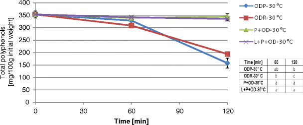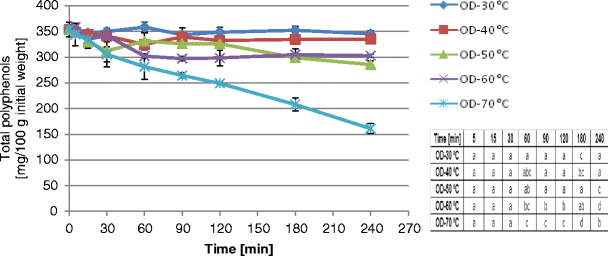 Changes in total polyphenol content in highbush blueberry fruits during osmotic dehydration (OD) in 65 °Brix sucrose solution (without pretreatment) at different temperatures (30, 40, 50, 60, and 70 °C). In the tables attached, the same letter in different cells within a given column indicates a lack of statistical differences (α = 0.05) between the results at particular processing times