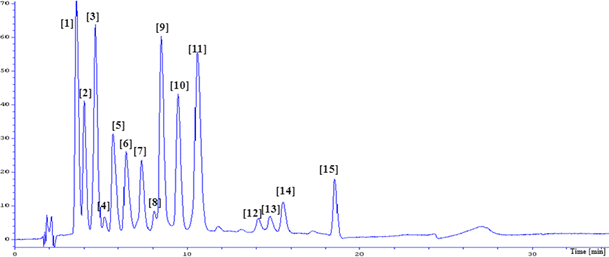 Chromatographic analysis was performed using a Knauer HPLC chromatograph with Phenomenex Gemini 5u C18 110A columns [150 × 4.60 mm] with a Phenomenex Security Guard Cartridge system [4 × 3.0 mm] and a DAD detector at 40 °C and a flow rate of 1 ml min−1; phase A: H2O/HCOOH (9:1, v/v) and phase B: ACN/H2O/HCOOH (95:4:1, v/v). The gradient program was as follows: 0–0.6 min, 12 % (v/v) B; 0.6–16 min, 12–30 % (v/v) B; 16–20.5 min 30–100 % (v/v) B; 20.5–22 min, 100 % (v/v) B; 22–25 min, 100–12 % (v/v) B, 25–35 min, 12 % (v/v) B. The injection volume was 20 μL. Data were collected using the Eurochrom 2000 software (Knauer, Berlin, Germany). Separation was performed on extract obtained as specified in Phenolic Extraction.