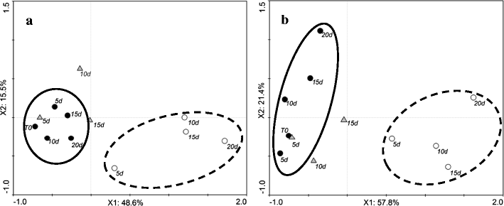 PCA scores of tomato volatiles assessed by SPME-GC-MS of the cvs Amoroso RZ (a) and Cappricia RZ (b). Measurements were done during storage for up to 20 days at 4 °C (open circles) and 16 °C (filled circles) and after 1 day of restoration at 16 °C following a storage period of 5, 10 and 15 days at 4 °C (filled triangle). The number next to each point indicates the number of days of storage. Each point is the average of three measurements of samples from a batch of five fruit. The data belonging to 16 and 4 °C have been circled with a solid and dash line, respectively