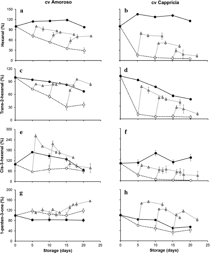 Volatiles derived from lipid metabolism assessed by SPME-GC-MS analysis of cvs Amoroso RZ (left column a, c, e, g) and Cappricia RZ (right column b, d, f, h). Measurements were done during storage for up to 20 days at 4 °C (open circle) and 16 °C (filled circle) and after restoration at 16 °C following a storage period of 5, 10 and 15 days at 4 °C (filled triangle). Each point is the average of three measurements plus standard deviation of samples from a batch of five fruit. SD bars are not visible; they were smaller than the symbol. Volatile abundance at t = 0 was set at 100 %