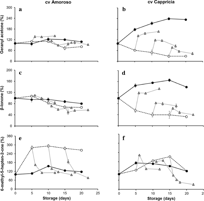 Volatiles derived by carotenoid metabolism assessed by SPME-GC-MS analysis of cvs Amoroso Z (left column a, c, e) and Cappricia RZ (right column b, d, f). Measurements were done during storage for 5, 10 and 15 days at 4 °C (open circle) and 16 °C (filled circle) and after restoration at 16 °C following a storage period of 5, 10 and 15 days at 4 °C (filled triangle). Each point is the average of three measurements plus standard deviation of samples from a batch of five fruit. SD bars are not visible; they were smaller than the symbol. Volatile abundance at t = 0 was set at 100 %
