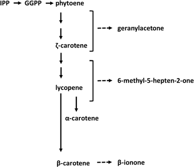 Particularly 6-methyl-5-hepten-2-one, production was shown to be correlated with phytoene synthase activity, a key enzyme in the synthesis pathway of lycopene. Indeed, this molecule can be synthetized from lycopene precursors such as prolycopene, δ-carotene and neurosporene (Mathieu et al. 2009; Tieman et al. 2006; Baldwin et al. 2000; Lewinsohn et al. 2005; Simkin et al. 2004) as well as from lycopene oxidation.