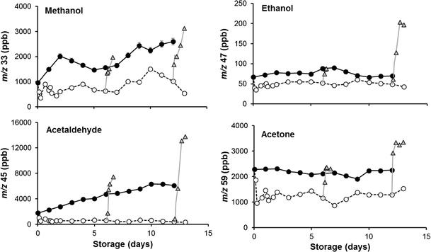 Off-flavour volatiles assessed by PTR-MS (coupled with the chewing device) of cv. Amoroso RZ. Measurements were done during 13 days of storage at 4 °C (open circle) and 22 °C (filled circle) and immediately after temperature restoration to 22 °C following a storage period of 6 and 12 days at 4 °C (filled triangle). Each point is the average of the measurements of three individual tomatoes plus standard deviation measured 30 s after the artificial mastication. SD bars are not visible; they were smaller than the symbol