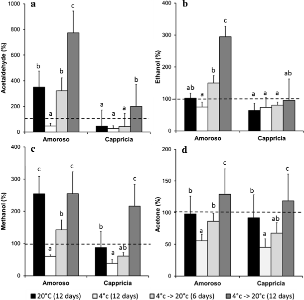 Off-flavour volatiles- acetaldehyde (a), ethanol (b), methanol (c), and acetone (d) - measured by PTR-MS (coupled with the chewing device) expressed as percentage of the initial value assessed at harvest (t0 = 100 %; dotted line). Each point is the average plus standard deviation of measurements of three individual tomatoes measured at 30 s after the artificial mastication. The prior low temperature-stored samples were assessed 1 day after restoration to room temp. Different letters within the same tomato cultivar indicate significant differences (LSD, p < 0.05)