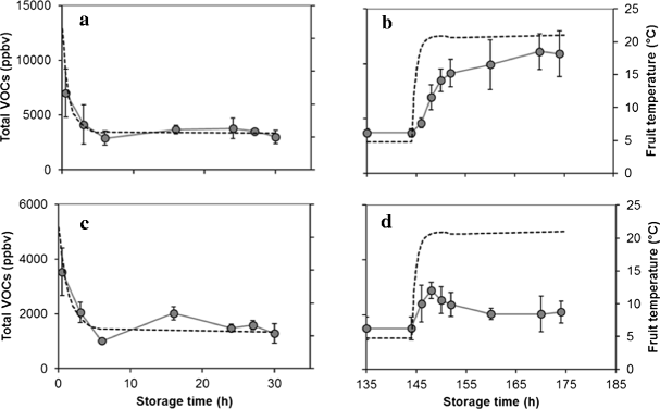 Comparison of internal fruit temperature (black dashed line) and the changes of total volatile production (grey circles) assessed by PTR-MS coupled with a chewing device of tomato fruits of cv Amoroso (a, b) and Cappricia (c, d). Each point is the average plus standard deviation of measurements of three tomatoes measured 30 s after the artificial mastication. SD bars are not visible; they were smaller than the symbol