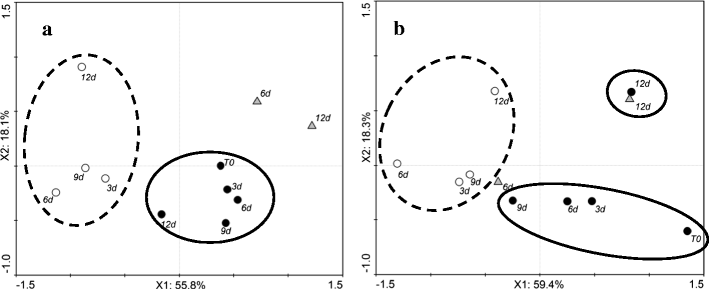 PCA scores of tomato volatiles assessed by PTR-MS (coupled with the chewing device) of the cvs. Amoroso RZ (a) and Cappricia RZ (b). Measured were done during 12 days of storage at 4 °C (open circle) and 22 °C (filled circle) and after 1 day of restoration at 22 °C following a storage period of 6 and 12 days at 4 °C (filled triangle). The number next to each point indicates the number of days of storage. Each point is the average of the measurements of three individual tomatoes measured 30 s after the artificial mastication. The data belonging to 22 and 4 °C have been circled with a solid and dash line, respectively