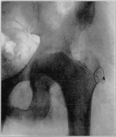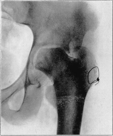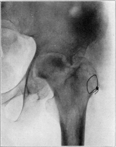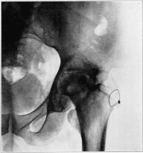 Case 1. One hundred and fifty-one days after operation. Density of necrotic head unchanged but shaft and pelvis show atrophy of disuse.