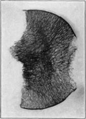 Roentgenogram of slice of excised head in Fig. 7, showing old necrotic bony trabeculae still undisturbed.