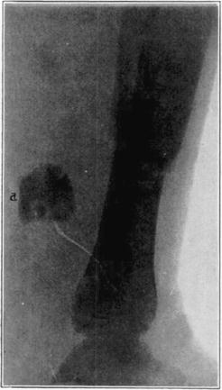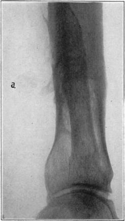 Case 4. Large splinter (a) displaced into soft parts from fresh fracture of tibia.