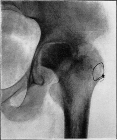 Operations which involve severence of bone or extensive separation of soft parts from bone may occasionally interfere with blood supply sufficiently to cause massive necrosis. An example of this is the necrosis of the head and neck of the femur in the following case in which arthroplasty of the hip was performed.