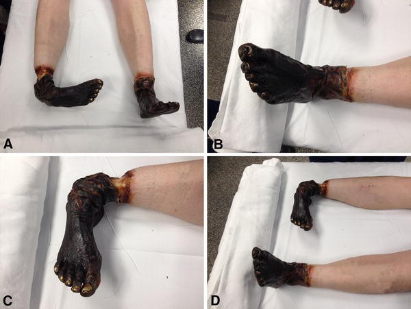 (A) The distal end of each of the patient’s feet is mummified while the proximal end of each is slowly sloughing. There is a transition zone with underlying inflammation. (B) A small area of erythema with exudate underlining the mummified tissue can be seen in the left foot. (C) The foot deformity is the result of the patient ambulating on her right foot to transfer to her wheelchair. (D) Stable, mummified tissue with an erythematous base is evident in both feet. The patient reported no pain despite the appearance of her feet.