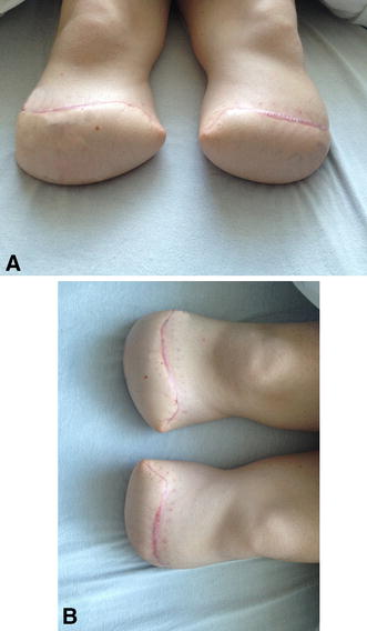 Photographs taken (A) 8 weeks after surgery (B) show well-healed incisions with healthy tissue flaps. The patient is ready for prosthesis fitting.