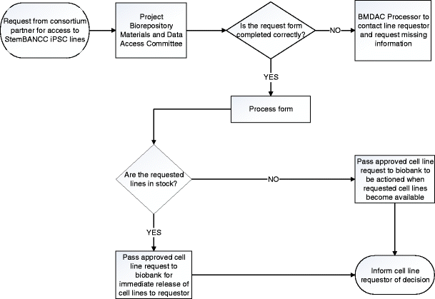 When developing a governance framework for internal materials and data sharing within the StemBANCC consortium, the field of biobanking provides a useful starting point. Extant biobank governance frameworks include formal regulatory documents and procedures, such as mandatory licenses and review from Research Ethics Committees, as well as less formal norms of working with tissue culture, guidelines on best practice, policy documents, input from leaders in the field and mechanisms such as project Data Access Committees [8]. The basic components of the StemBANCC materials and data sharing framework, such as a Data Access Committee and a materials and data access policy document, were adopted from this list. In addition, the development of a specific governance framework needs to be targeted to the specific task of sharing materials and data and must be proportionate in making sure the burden of governance in terms of time and workload does not outweigh the advantages of having a governance framework. [8] The way in which these principles were enacted in practice is illustrated in the next section describing the design and implementation of the StemBANCC materials and data access framework.