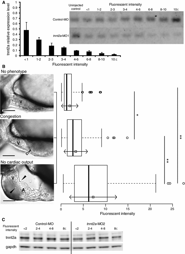 Expression level of tnnt2a and the cardiac phenotypes of zebrafish injected with tnnt2a-MO are correlated with the FI of Lis-MO in the embryo. a The expression level of cardiac troponin T (tnnt2a) was dependent on the fluorescent intensity (FI) from co-injected control antisense oligonucleotides (MO) labeled with the fluorophore lissamine (Lis-MO) in tnnt2a morphants classified by several ranges of the FI. b Zebrafish injected with 1 μM tnnt2a-MO2 showed three different cardiac phenotypes: no phenotype; congestion (white arrowhead shows accumulated blood in the sinus venosus); and no cardiac output (black arrowhead shows an abnormal atrioventricular valve). The FI of Lis-MO in zebrafish was significantly different among the three phenotypic groups (*p < 0.05 and **p < 0.01, Bonferroni test). These relative expressions are normalized ratios of tnnt2a/gapdh to the control with a FI value less than 1. The white squares and arrows in the boxplot are the mean value and ±SD of each group, respectively (no phenotype, n = 112; congestion, n = 153; no cardiac output, n = 183). c Western blotting was performed to validate the effect of tnnt2a-MO2. The zebrafish embryos injected with 1 μM control-MO and tnnt2a-MO2 were classified into four groups based on the FI from co-injected Lis-MO: (i) FI < 2, (ii) FI ≥ 2 and <4, (iii) FI ≥ 4 and <8, and (iv) FI ≥ 8. We performed an immunoblotting assay to quantify expression levels of tnnt2a protein in each group (n = 10–17). Scale bar 100 μm. A atrium; V ventricle