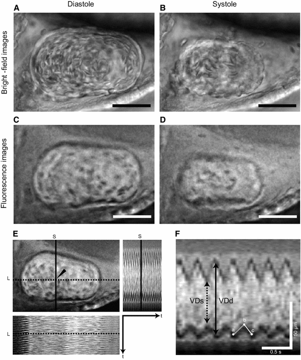 Zebrafish embryos were dechorionated and immersed for 3–5 h in egg water containing 0.2 μM of Bodipy-ceramide (BODIPY® FL C5-ceramide, Invitrogen). The stained embryos were placed on a coverslip and embedded in 3 % methylcellulose solution. Embryos were arranged with the anterior to the left of the field and ventral surface down. In this position, the ventricle was clearly visible using an inverted florescence microscope (Axiovert 200M, Carl Zeiss, Oberkochen, Germany). Finally, the embryo was covered with 2 % ultralow gelling agarose (Agarose Type VII, A4018, Sigma-Aldrich) to fix its position. A coverslip was placed on the stage of the microscope (Thermo plate, Tokai Hit, Shizuoka, Japan) and maintained at 28 °C. Time-lapse images of the zebrafish ventricle were recorded at approximately 20 frames per second using AxioVision software (Rel. 4.6, Carl Zeiss) and a digital camera (AxioCam, Carl Zeiss). The imaging duration was 5 s using a GFP filter and 15 s for bright field.