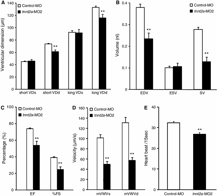 Impairment of diastolic distensibility and ventricular wall velocities during systole and diastole in zebrafish by knockdown of tnnt2a. In the control group, zebrafish were injected with control MO (1 μM) and Lis-MO (50 μM). In the tnnt2a knockdown group, zebrafish were injected with tnnt2a-MO2 (1 μM) and Lis-MO (50 μM). We selected zebrafish embryos, which showed FI values between 2 and 5 in the control group at 60 h post-fertilization (hpf), and compared them with tnnt2a morphants with blood congestion and FI values from 2 to 5 in the tnnt2a knockdown group at 60 hpf. a–d Cardiac parameters were measured from M-mode images of ventricles in groups of zebrafish injected with either control-MO or tnnt2a-MO2 at 60 hpf: a The ventricular end systolic dimension (VDs) and the ventricular end diastolic dimension (VDd) of both short and long axes; b the end diastolic volume (EDV) and end systolic volume (ESV) and stroke volume (SV); c ejection fraction (EF) and fractional shortening (%FS); and d mVWVs and mVWVd. Values are mean ± SE (control-MO, n = 24; tnnt2a-MO2, n = 10). Statistical analysis was performed to examine significant differences from the mean control values (**p < 0.01, *p < 0.05, Student’s t test)