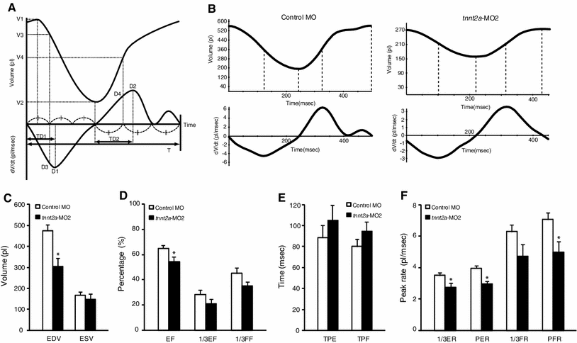 Time–volume curve (TVC) analysis showing decreased EDV, EF, and peak rates during systole and diastole by knockdown of tnnt2a. We also assessed cardiac parameters of both experimental groups using TVC analysis. a The upper and lower graphs show the TVC and the differentiation curve, respectively. b The TVC and the differentiation curve of control zebrafish are shown (left) alongside those of a tnnt2a morphant with congestion in the sinus venosus (right). c–f Cardiac function was assessed using TVC analysis based on fluorescent cardiac images using Bodipy-ceramide. The calculated parameters were as follows: c EDV and ESV; d EF, first third EF (1/3EF), and first third filling fraction (1/3FF); e time to peak ejection (TPE) and time to peak filling (TPF); and f first third ejection rate (1/3ER), peak ejection rate (PER), first third filling rate (1/3FR) and peak filling rate (PFR). Values are mean ± SE (control MO, n = 24; tnnt2a-MO2, n = 10). Statistical analysis was performed to examine significant differences from the mean control values (*p < 0.05, Student’s t test)