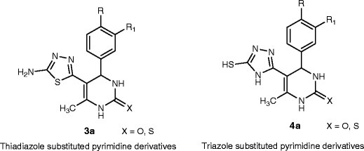 A series of ten derivatives of 5-(5-amino-1,3,4-thiadiazole-2-yl)-3,4-dihydro-6-methyl-4-phenylpyrimidin-2(1H)-one and ten derivatives of 3,4-dihydro-5-(5-mercapto-4H-1,2,4-triazol-3-yl)-6-methyl-4-phenyl pyrimidin-2(1H)-one have been synthesized and structures characterized. Among the synthesized derivatives, triazole substituted compounds have shown higher antibacterial inhibition when compared to the thiadiazole derivatives.