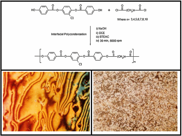 Synthesis of thermotropic liquid crystalline polyesters derived from bis[4-hydroxy benzoyloxy]-2-chloro-1,4-benzene (BHBOCB) and aliphatic dicarboxylic acid chlorides by interfacial polycondensation methodology is presented. Synthesised polyesters consist of bis[4-hydroxy benzoyloxy]-2-chloro-1,4-benzene as a mesogen and aliphatic diacid chloride as flexible spacer. The length of oligomethylene units in the polymer was varied from the trimethylene to the dodecamethylene groups. Synthesized polyesters were characterized by differential scanning calorimetry and optical microscopy. The transition temperatures and thermodynamic properties were studied for all these polymers. These polyesters exhibited thermotropic liquid crystalline behavior and showed nematic texture except decamethylene spacer. Decamethylene spacer based polyester showed marble texture of smectic C. Mesophase stability of these polyesters was higher than \(123{^{\circ }}\hbox {C}\) (except first heating cycle of PE-1).