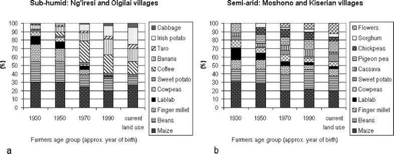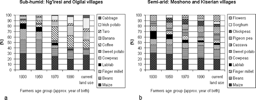 In contrast to South Asia, wild, undomesticated lablab has been found to occur naturally in several African countries (Verdcourt 1970, 1979), and both the wild types and domesticated African landraces have been shown to be genetically diverse (e.g., Liu 1996; Maass et al. 2005; Tefera 2006). Lablab has been a traditional crop in eastern Africa (Westphal 1974; Maundu et al. 1999) although its use has dramatically decreased in recent years (Maundu et al. 1999; Ngailo et al. 2003). In an assessment of traditional knowledge about land use along a humidity gradient in Arumeru district of Tanzania, Ngailo et al. (2003) found that, in the sub-humid villages, lablab, as a field crop, was cultivated on about 10% of the land during the 1930s, but its use had decreased to almost nothing by 2000 (Fig. 3). Despite this decline, however, lablab appears to persist as a garden crop (rather than a field crop) in eastern and southern Africa; and recent market surveys from eastern Africa suggest that there is a high demand (and subsequently a good price) for lablab in Kenya (Ngailo et al. 2003).