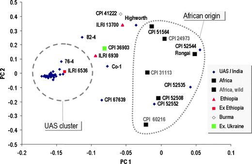 Despite the impressive agro-morphological variation available, particularly in southern Asia, it appears that lablab in that region is genetically less diverse than material from Africa. Sultana et al. (2000) revealed that the 20 landraces from Bangladesh studied by RAPD markers were genetically similar and more related to most of the approximately 60 accessions received from CSIRO, Australia of other Asian origins than to those from diverse origins in Africa. Similarly, Venkatesha et al. (2007) showed that 62 southern Indian landraces analyzed either by AFLP or EST markers only exhibited narrow genetic diversity. When these Indian landraces were compared to the very significant genetic variation within the core collection proposed by Pengelly and Maass (2001), the limited genetic diversity available in the landraces collected from southern India became even more apparent (Fig. 1). In a molecular diversity assessment applying AFLP markers (Fig. 2), Tefera (2006) showed, on the other hand, that East African landraces were fairly distinct from the proposed core collection that was chosen to represent both agro-morphological variation and a broad range of geographical origins (Pengelly and Maass 2001). Accordingly, these newly collected East African landraces could even genetically expand the proposed core collection. The recognition of limited genetic diversity available in Indian indigenous landraces and in Indian plant improvement programs has led Mahadevu and Byre Gowda (2005) to initiate the addition of ‘exotic’ germplasm sourced from the USDA-held collection to their breeding program at UAS Bangalore.
