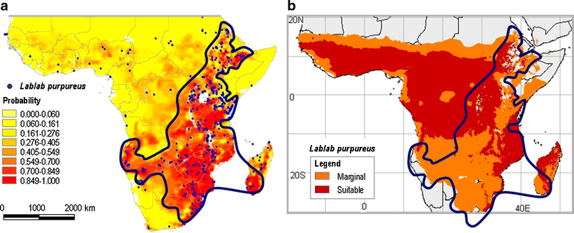 In recent years, so-called ‘lost crops’ have been appraised in a number of reviews, among them Lablab purpureus in the context of African vegetable species. This crop cannot truly be considered ‘lost’ because worldwide more than 150 common names are applied to it. Based on a comprehensive literature review, this paper aims to put forward four theses, (i) Lablab is one of the most diverse domesticated legume species and has multiple uses. Although its largest agro-morphological diversity occurs in South Asia, its origin appears to be Africa. (ii) Crop improvement in South Asia is based on limited genetic diversity. (iii) The restricted research and development performed in Africa focuses either on improving forage or soil properties mostly through one popular cultivar, Rongai, while the available diversity of lablab in Africa might be under threat of genetic erosion. (iv) Lablab is better adapted to drought than common beans (Phaseolus vulgaris) or cowpea (Vigna unguiculata), both of which have been preferred to lablab in African agricultural production systems. Lablab might offer comparable opportunities for African agriculture in the view of global change. Its wide potential for adaptation throughout eastern and southern Africa is shown with a GIS (geographic information systems) approach.