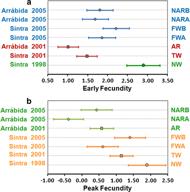 Early evolutionary rate for the populations founded between 1998 and 2005. For each set of populations the average slope for the first 15–21 generations after foundation is presented (linear regression of the differences to control). a Early fecundity; b Peak fecundity. For each trait and foundation the bar represents the standard error of the slope estimated from the linear mixed-effects model: trait ~ generation + foundation + generation * foundation