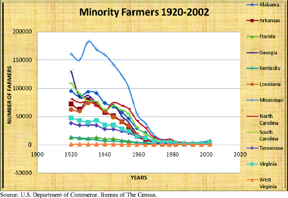 Wood and Gilbert (1998) asserted that farming may be less attractive to the younger generation due to the fact that it is looked at as a memory of slavery and sharecropping. Their beliefs are that we are wasting our time on trying to convince others to enter farming but to encourage the improvement of poor rural communities through education, training, and economic development. They believe that if agriculture would be a more viable business and a way of life by encouraging land retention and recovery efforts from the past, then the decline of African-American farmers and landowners could be reversed. Wood and Gilbert (2000) stated that the primary reason for decline of African-American farmers was due to the twin engines of increased mechanization and the dismantling of the sharecropping system. The research primarily targeted African-American farmers in the Mississippi Delta. However, these previous studies showed that a significant amount of African-American farmers still owned their land and would like to return but due to public policies, economic pressures, and racial oppression, many minority farmers find it impossible to return.