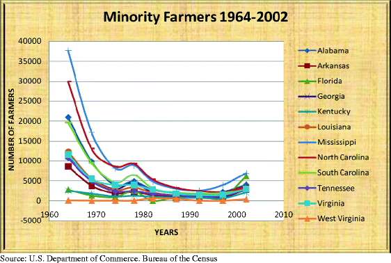 Number of minority farmers, twelve Southeastern States and Texas, 1964–2002
