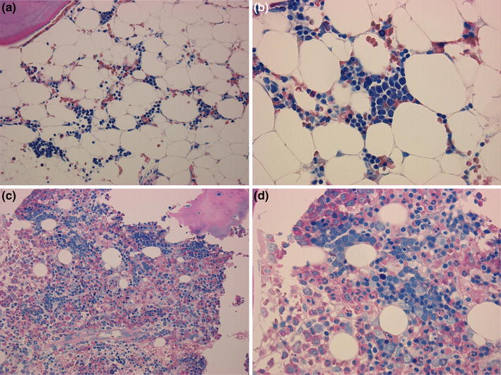 Representative pictures of bone marrow (BM) biopsies obtained from patients with pediatric low-grade MDS (AS-D naphthol chloroacetate esterase stain with Giemsa staining). a, b BM specimens of hypocellular refractory cytopenia of childhood; c, d those of hypercellular refractory cytopenia with multilineage dysplasia. a Patchy distribution of erythropoiesis accompanied by sparsely distributed granulopoiesis, in an otherwise adipocytic BM. b Immature erythroid precursors form one or several islands. c Immature erythropoiesis and granulopoiesis are distributed diffusely. d Left-shifted erythroid and myeloid cells are increased. These pictures were provided by the courtesy of Dr. Masafumi Ito