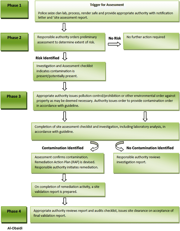 General process for site investigation and reporting under the Australian Government Clandestine Drug Laboratory Remediation Guidelines (sourced from Newell et al. [38]). The figure shows the four phases in the notification and remediation process that are recommended to be followed by the various agencies involved in clandestine drug laboratory remediation