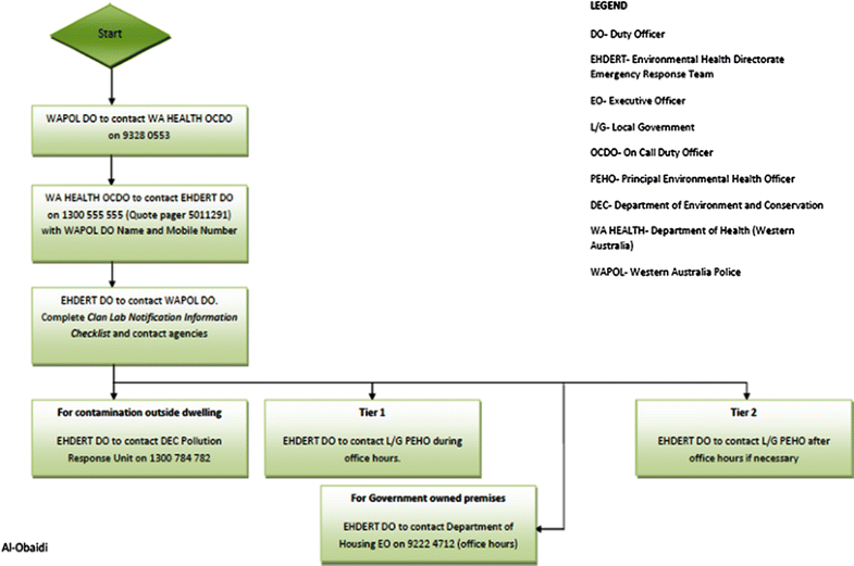 Flowchart of the notification process of illegal drug laboratories in Western Australia (sourced from WA Health [39]). The figure shows that the procedure begins with notification by the Western Australia Police and also outlines what is to be done for tier 1 (during office hours) and tier 2 (outside of office hours) notifications