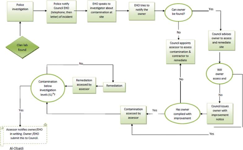 Victoria Department of Health flow chart for remediation of clandestine drug laboratory sites (sourced from Victoria Department of Health [41]). The flow chart outlines the Victoria Department of Health procedures, general roles of EHOs, other agencies and property owners and the decision-making process for remediation of clandestine drug laboratory sites