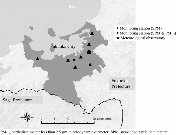Japanese Air Quality Standards [6] apply to suspended particulate matter (SPM that passes through a size-selective inlet with a 100 % cut-off level of 10 μm in aerodynamic diameter) and PM2.5, so PM10 (particles that pass through a size-selective inlet with a 50 % cut-off level of 10 μm in aerodynamic diameter) is not monitored in Japan. In the present study, therefore, we defined the difference between concentrations of SPM and PM2.5 as an exposure surrogate of coarse particulate matter. Our hypothesis was that coarse particulate matter would cause acute health effects. To examine this hypothesis, we conducted time-stratified case-crossover analyses to investigate any association between short-term exposure to coarse particulate matter and emergency ambulance dispatches, which were used as a proxy marker of acute health events. We have previously reported that exposure to PM2.5 was positively associated with ambulance dispatches in Fukuoka City, Japan, where PM2.5 concentrations had measured before Air Quality Standards for PM2.5 were established in 2009 [7]. We used the same dataset in this study.