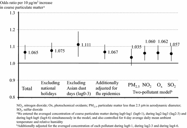 Conditional logistic regression models were used to examine the association between coarse particulate matter and emergency ambulance dispatches. Then, to examine lag pattern of coarse particulate matter and control for confounding by it, we applied a lag-stratified distributed lag model [13] and included the average concentrations of coarse particulate matter during the case day (lag0) to 1 day preceding it (lag1) (lag0–1), during lag2–lag3 (lag2–3), and during lag4–lag6 (lag4–6) [14]. Odds ratios (ORs) for a 10 μg/m3 increase in coarse particulate matter concentrations with 95 % confidence intervals (CIs) were calculated after adjustment for the mean ambient temperature (a natural spline with 4 degrees of freedom) and relative humidity from the case day (lag0) to 3 days before (lag3). We performed stratified analyses by age strata (0–19 years, 20–64 years, and 65 years or older), and using likelihood ratio tests to check whether the effects of coarse particulate matter concentrations on ambulance dispatches were modified by age strata. In addition, we conducted several sensitivity analyses. First, to eliminate the possibility of bias in control selection, we excluded dispatches occurring on national holidays. Second, we excluded dispatches occurring on “Asian dust” days (lag0–3) (Asian dust is mineral dust blown from deserts in China and Mongolia to western Pacific regions [15]). Because exposure to Asian dust is reportedly associated with emergency ambulance dispatches [16], it was important to look for associations between coarse particulate matter concentrations and ambulance dispatches after excluding days of extra-high exposure to this natural coarse particulate matter. Third, we additionally included influenza epidemics in the model. Finally, to evaluate the independent effects of coarse particulate matter, we constructed two-pollutant models adjusted for co-pollutants, namely PM2.5, NO2, Ox, and SO2. Although we took into consideration the effects of season (spring, summer, autumn, and winter) in terms of the association between coarse particulate matter and ambulance dispatches, statistical evidence of effect modification by season was not observed (p for effect modification = 0.31).