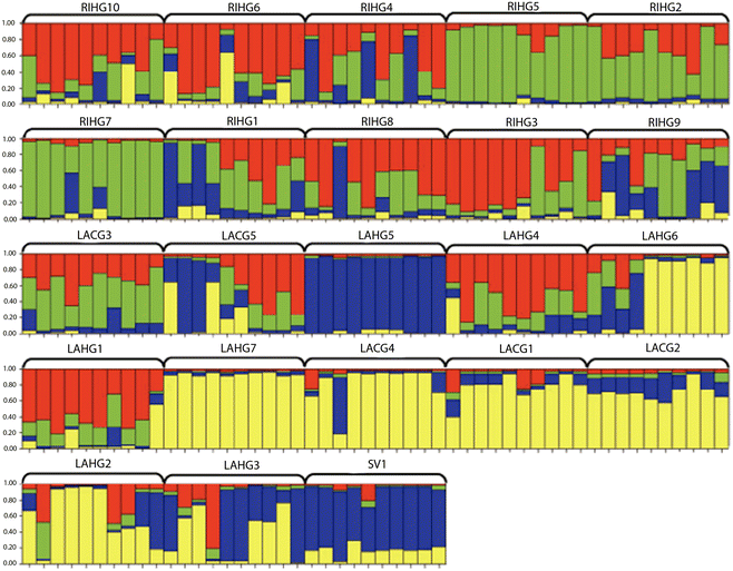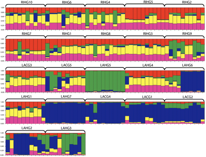 The program STRUCTURE assigned genetic affiliations to the sampled individuals within preselected populations. The most likely number of groups for all garden populations (unresolved amplifications treated as missing) was K = 5 (Fig. 2). Generally, most populations showed a moderate to high degree of admixture, except for population LAHG5, which grouped independently and uniformly from other garden populations. Also, populations LAHG6, LAHG7, LACG4, LACG1, LACG2, and LAHG2 showed some affiliation with each other.