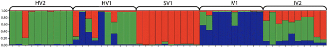 STRUCTURE analysis of garden populations of maize including imported supermarket variety SV1. Most likely grouping K=4.