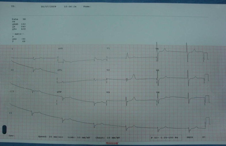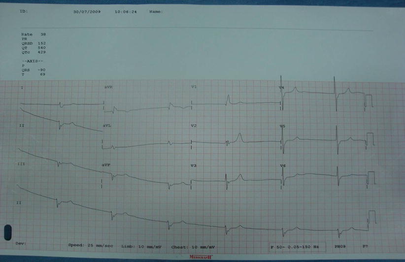 The initial 12-lead ECG (25 mm/s, 5 mm/mV) obtained on presentation to the emergency department demonstrates a sinus bradycardia with prolonged atrial conduction (flattened P waves) and an intraventricular conduction delay (QRS, 154 ms)