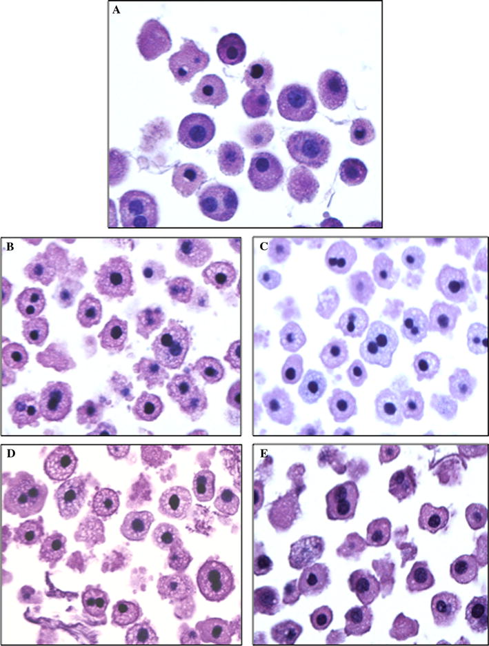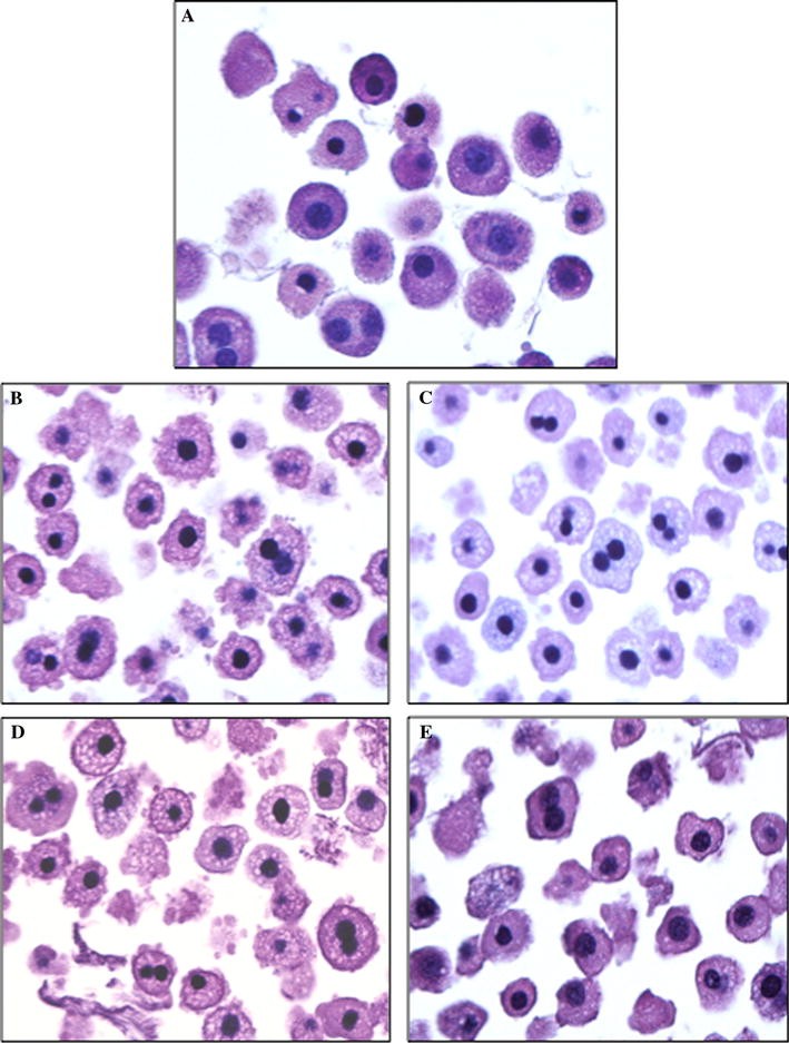 Cellular pellets resuspended in 3 ml of buffered formalin (as indicated above) were incubated at room temperature for 12 h. The cell suspensions were then centrifuged at 1,500×g for 10 min, and the cellular pellets were processed as a block. Paraffin-embedded sections were cut at 4 μ and then stained with hematoxylin-eosin. Sections were photographed with a Nikon Eclipse 50i microscope (Nikon, Tokyo, Japan), using a Plan Fluor 1000X objective with the Nikon digital sight DS-L1 camera system.