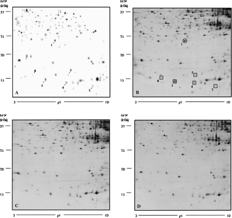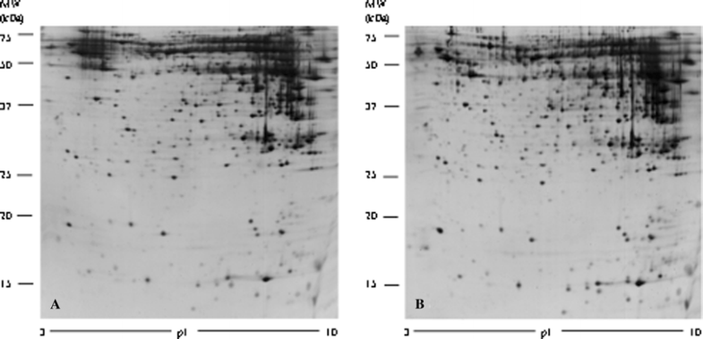 We detected a large number of protein spots on each 2DE gel, with a mean number of 520 spots. The modifications in protein expression in the different groups of treatment were evaluated using the PDQuest software: only protein spots with a twofold intensity variation were selected for statistical analysis.
