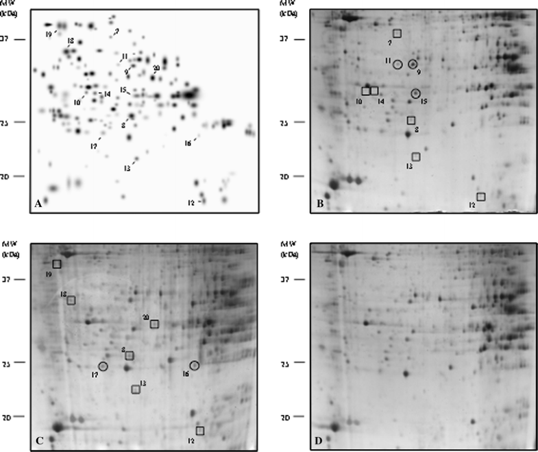 Comparative analysis of 12.5 % acrylamide/SDS 2DE gels. a A master gel representing the spots derived from 2De gels of oleic acid-treated hepatocytes, b a representative 2DE gel from CLA mix-treated hepatocytes, c a representative 2DE gel from c9,t11 CLA-treated hepatocytes, and d a representative 2DE gel from t10,c12 CLA-treated hepatocytes. Squares indicate down-regulated proteins, circles over-expressed proteins respect to oleic acid treatment