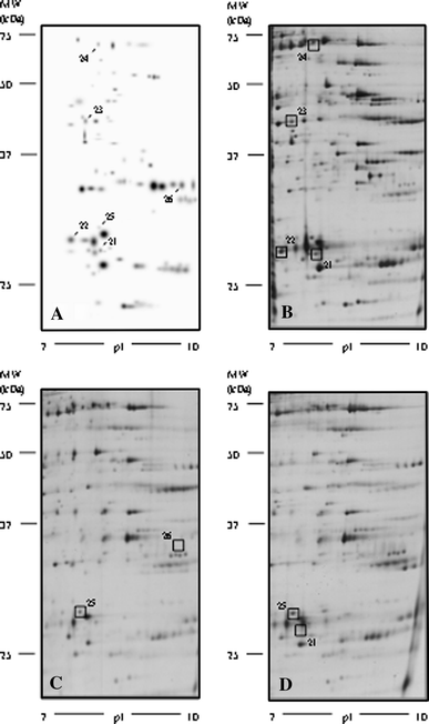 Comparative analysis of 10 % acrylamide/SDS 2DE gels of isolate hepatocytes. All protein spots were down-regulated and indicated by squares. IGP strips were in a 7–10 pH range. a Oleic acid master gel, b CLA mix, c c9,t11 CLA, and d t10,c12 CLA-treated hepatocytes